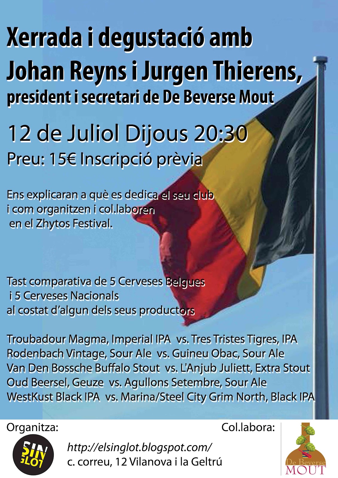 We hebben dan ook met veel enthousiasme over en weer gemaild en hebben een proeverij in elkaar gestoken waarbij we 5 catalaanse bieren tegenover 5 Belgische bieren hebben gezet, hieronder staat de affiche met alle bieren. De proeverij werd nog voorafgegaan door een degustatie van Fieleken, ons eigen bier van de bierclub gebrouwen door brouwerij Dijckwaert uit Herentals. De Belgische bieren waren : Troubadour Magma en Westkust van The Musketeers, Buffalo Stout van Van Den Bossche, Oude Geuze Oud Beersel en Rodenbach Vintage 2009. De bieren van de Catalanen waren van onder andere volgende brouwers guineu,l'anjub, Les Agullons waarbij enkele van de brouwers ook aanwezig waren bij de degustatie. Tres Tristes Tigres is een samenwerking van drie brouwers Reptilian, Les Clandestines en La font Del Diable, de laatste is Pepe die zowat de organisator van de club is maar liever wordt aanzien als brouwer van smaakvolle bieren.